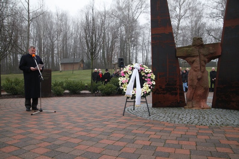Die Leiterin des Pfalzinstituts für Hören und Kommunikation, Dr. Hiltrud Funk, der Ortsbürgermeister von Klingenmünster, Erwin Grimm, Pfalzklinikum-Geschäftsführer Paul Bomke, der Bezirkstagsvorsitzende Theo Wieder und der Landesbeauftragte für Menschen mit Behinderung, Ottmar Miles-Paul legten an der Gedenkstätte für die Opfer des Nationalsozialismus Kränze nieder.
