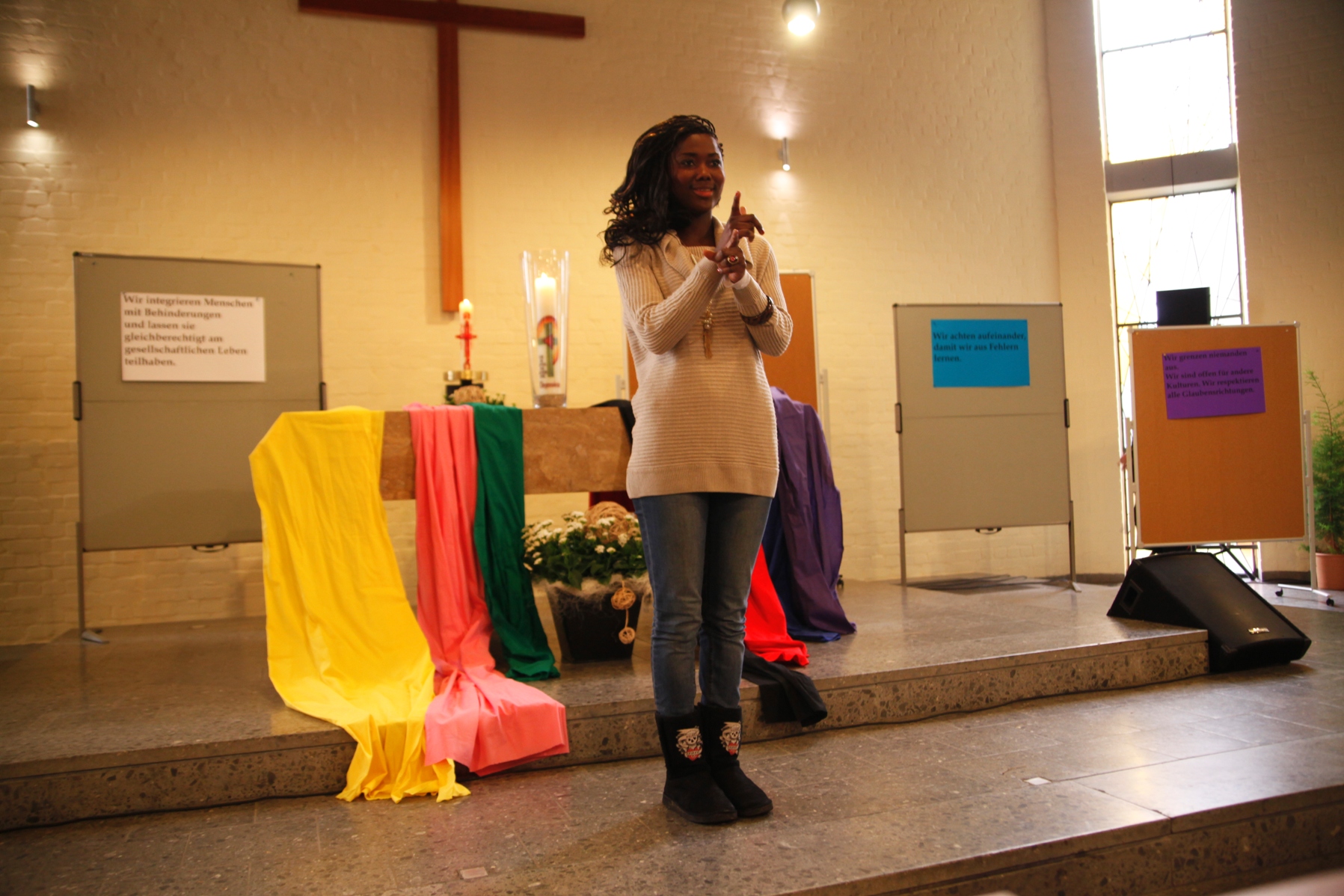 Nach der Kranzniederlegung gingen die etwa 100 Teilnehmer der Veranstaltung gemeinsam zur Klinikkirche. Unter dem Motto „Vorurteile und Ausgrenzung im Dritten Reich und heute“ gestalteten die Klinikseelsorger Joachim Geiling und Michael Reis gemeinsam mit Jugendlichen aus dem Pfalzinstitut Klingenmünster und dem Pfalzinstitut für Hören und Kommunikation einen Gottesdienst mit szenischer Lesung. Dabei gedachten die Seelsorger und Gäste der Menschen, die während der NS-Zeit gedemütigt, deportiert, gefoltert und getötet wurden. Die Jugendlichen erinnerten daran, dass die politische Propaganda während der NS-Zeit Vorurteile gegen verschiedene gesellschaftliche Gruppen schürte und sie mit verschiedenfarbigen Zeichen auf der Kleidung ausgrenzte. Für jede dieser Gruppen legten sie ein buntes Band auf den Altar und gingen auf die jeweiligen Vorurteile ein: „Schwarz stand damals für die Behinderten. Sie galten als dumm, schwachsinnig und idiotisch.“ Danach stellten die Jugendlichen Regeln für einen guten Umgang miteinander vor, wie beispielsweise: „Wir integrieren Menschen mit Behinderungen und sorgen dafür, dass sie am Leben in der Gesellschaft teilhaben. Wir respektieren alle Glaubensrichtungen und tolerieren verschiedene Formen von Beziehungen.“ Pfarrer Joachim Geiling betonte: „Am Anfang stand das Vorurteil – damals und heute. Vorurteile sind gefährlich, sie steuern, wie wir denken und handeln.“ Er zitierte aus einer empirischen Langzeitstudie der Universitäten Bielefeld und Marburg. Danach verfestigen sich in der deutschen Gesellschaft Rassismus und Islamfeindlichkeit. „Man sollte auf andere Menschen lieber frei, offen und neugierig reagieren und sich von ihrem Anderssein auch mal verstören lassen. Jeder von uns ist anders“, so Joachim Geiling.