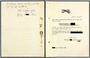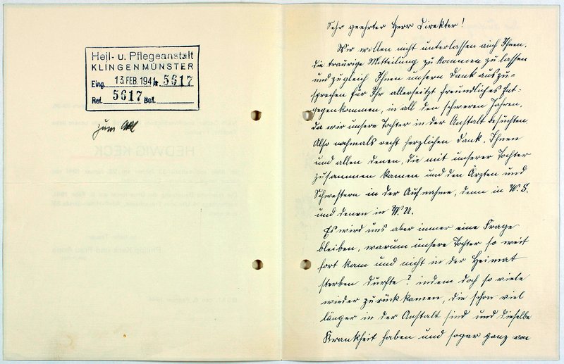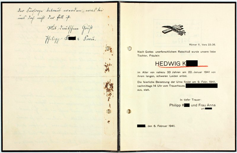 Kurze Zeit später erhalten sie die Nachricht vom Tod ihrer Tochter. Die Eltern senden der Klingenmünsterer Direktion die Todesanzeige und danken den Mitarbeitern für ihre Hilfe. Zwischen den Zeilen des Briefes zeigen sich aber auch Kritik und eine gewisse Kenntnis der Vorgänge. Am 20. Januar 1941 erhalten die Eltern die persönlichen Sachen der Hedwig K. zurück. Hedwig K. wurde in Pirna-Sonnenstein ermordet.