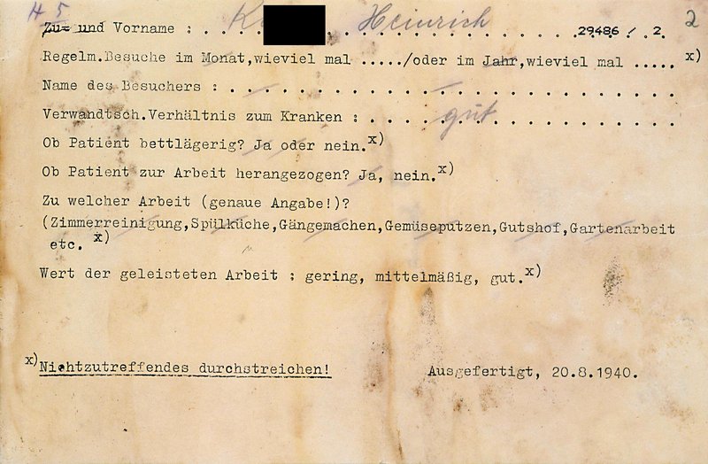 1936 kommt Heinrich K. ein letztes Mal nach Klingenmünster. Er erkennt Stationspfleger von früher wieder. Drei Jahre später wird er als »gemütlich völlig erloschen« beschrieben. Als man ihn im Januar 1940 nach seinem Alter befragt, antwortet er laut Krankenbericht: »Er sei nicht geboren. Wie er auf die Welt gekommen sei, wisse er nicht. Er sei mindestens 8000 Jahre alt.« Kurz darauf wird K. in die Anstalt Groß-schweidnitz/Sachsen gebracht und wenig später in der Tötungsanstalt Pirna-Sonnenstein bei Dresden mit Gas ermordet.